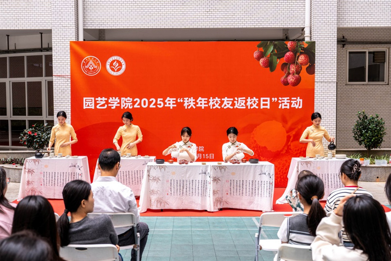 茶艺团同学带来的“同茗·茶艺表演”则为现场增添了一份雅致与宁静。在袅袅茶香中,表演同学动作舒缓、神情专注,将一杯杯清茶倒入杯中。以茶为媒,不仅传递出岭南茶文化的深厚韵味,更在静默的品茗之间,唤醒了校友们心中那份沉淀多年的同窗情谊,不少人在茶香中共忆往昔,感慨时光荏苒,情谊如茶,愈久愈醇。