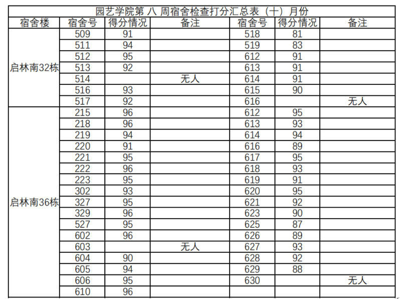 现将2025-2026学年第一学期第八周宿舍安全和内务卫生检查情况公示如下