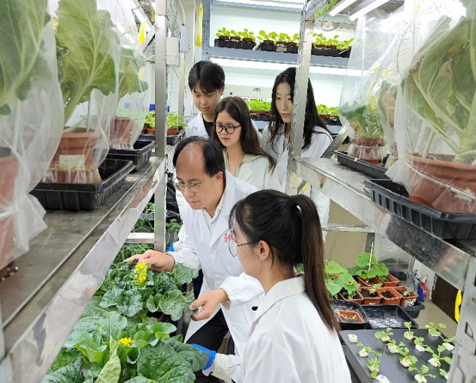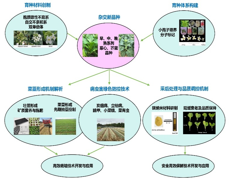 率先育成早、中、晚熟的优良菜心、芥蓝杂交新品种12个,首次利用小孢子培养育成芥蓝新品种1个;定位了芥蓝产量性状及花色基因,开发了与花瓣颜色基因共分离的分子标记;解析了壮苗形成的分子调控机制,发明了适宜于机械移栽的育苗盘及农机农艺融合配套育苗技术,解决了叶菜机械化移栽的技术瓶颈;揭示了菜薹形成生理机制,研制了菜薹先期抽薹控制技术,建立了基于物理与生物学途径防控关键病虫害的技术体系,发明了智能自动化无土栽培生产线及立体栽培方法,形成了高效栽培与智能化生产技术体系;首次研制出新型保鲜剂丹参碳纳米材料,明确了丹参碳点可有效延缓菜心衰老和品质降解,挖掘与解析了影响菜心衰老的关键基因和分子调控机制,填补了碳纳米材料在采后园艺产品保鲜应用中的空白,为维持采后品质提供新靶标和思路。