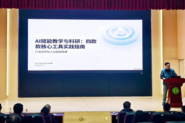 会上,林毅申老师以“AI工具整合应用”为核心,系统阐述了人工智能在教学与科研两大领域的具体实践路径。在教学方面,他介绍了AI如何辅助课程设计、实现个性化学习、生成教学内容与习题,并进行智能评估,以此提升教学效率与互动质量。在科研层面,他重点讲解了AI在文献分析、数据处理、实验模拟以及论文写作与编程等方面的强大辅助功能,并通过实例展示了AI技术如何优化科研流程,驱动创新。